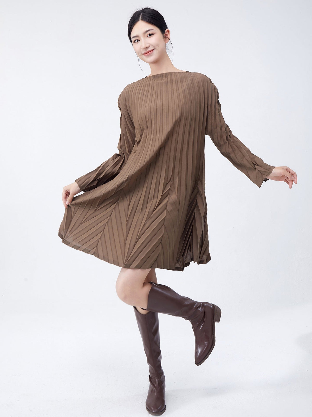 Swing Pleated A Line Mini Brown Dress